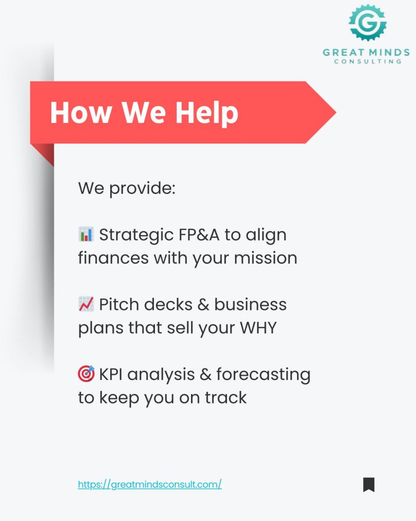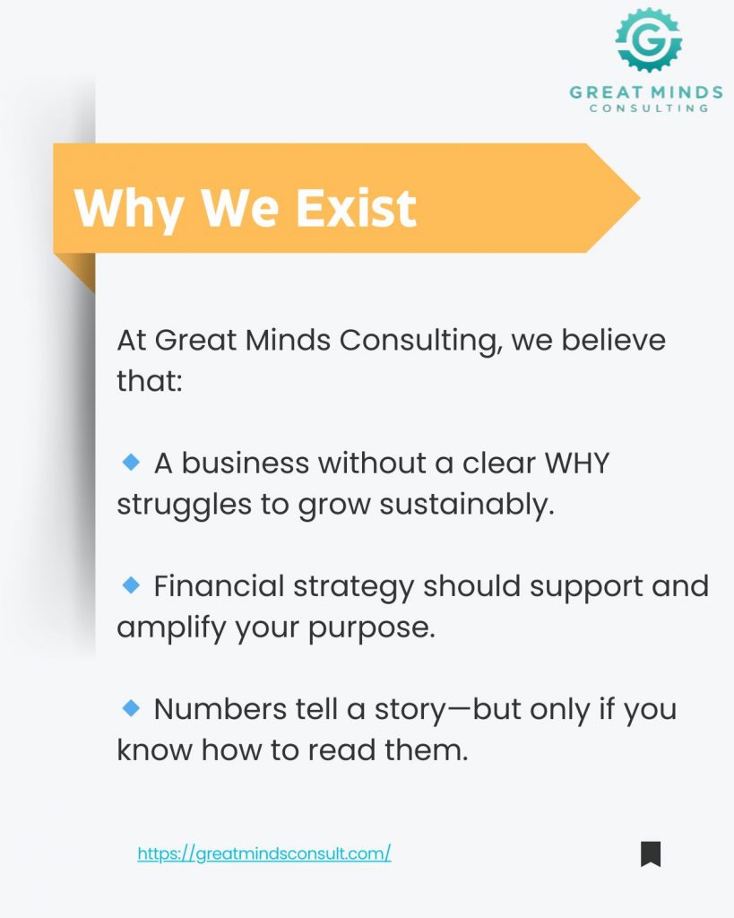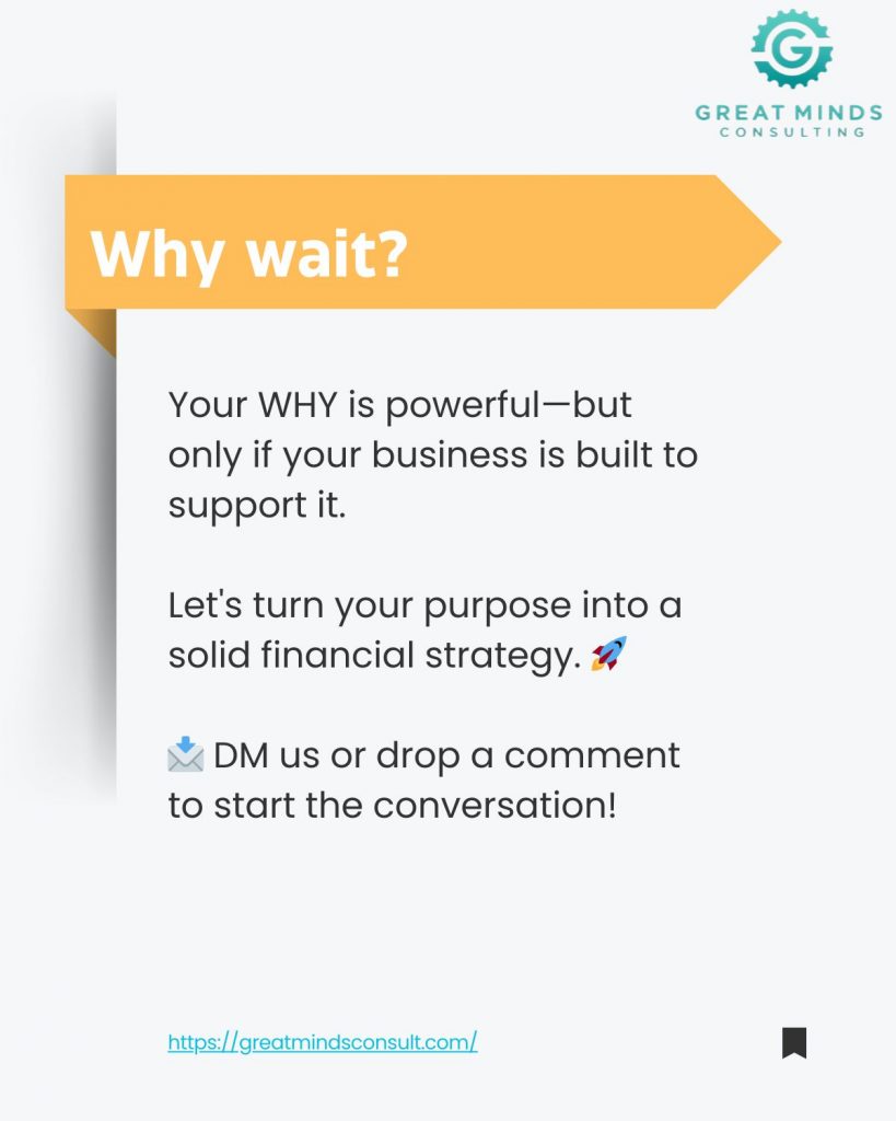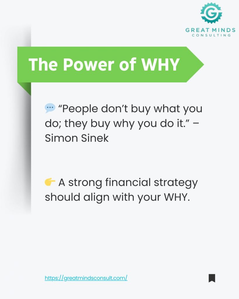 Simon Sinek said it best: โPeople donโt buy what you do; they buy why you do it.โ At ๐๐ซ๐๐๐ญ ๐๐ข๐ง๐๐ฌ ๐๐จ๐ง๐ฌ๐ฎ๐ฅ๐ญ๐ข๐ง๐ , we help businesses connect their financial strategy to their purpose. Because a strong WHY without a solid financial foundation is just a dream. In this carousel, Iโll show you why aligning your WHY with smart financial planning can attract investors, drive growth, and build a business that lasts. Swipe through and letโs start the conversation! ๐