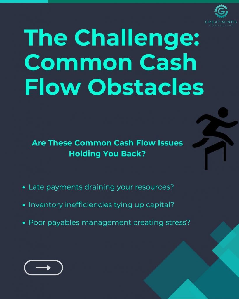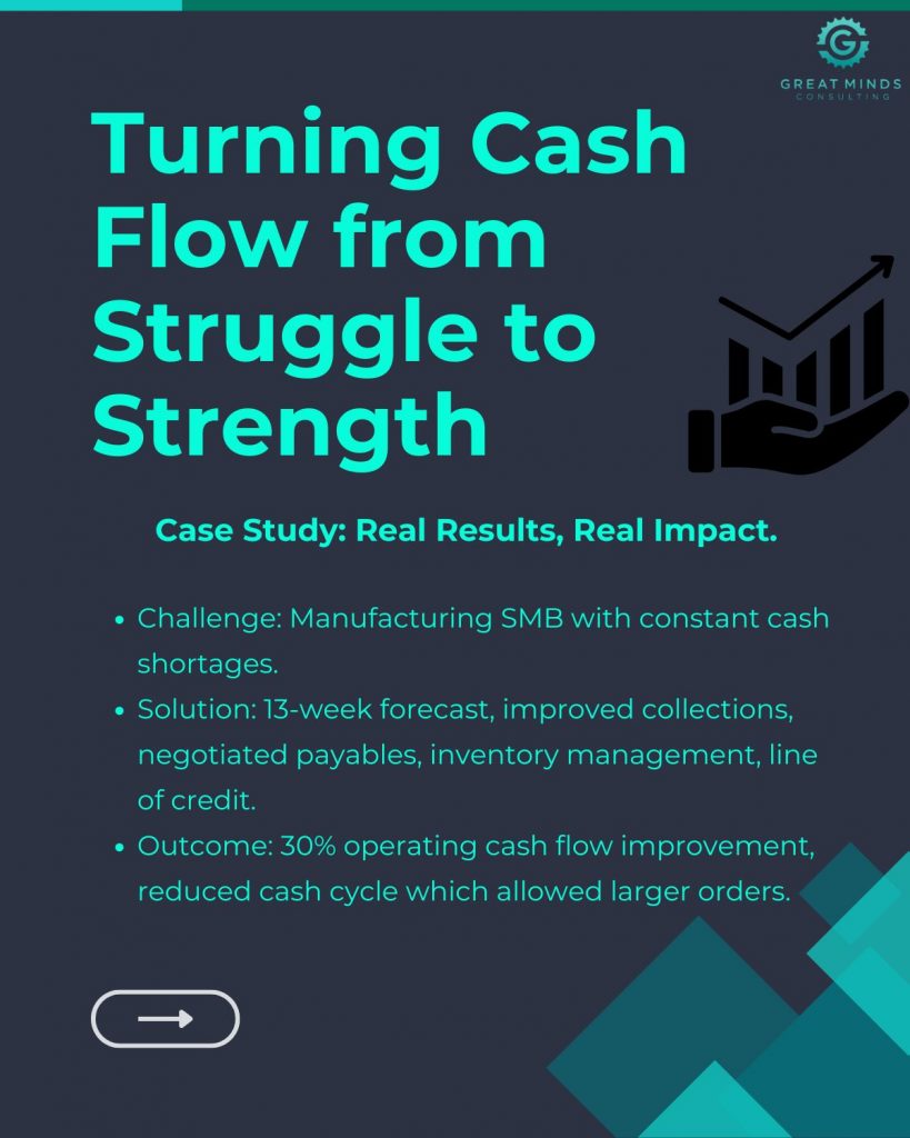 Tired of cash flow chaos? 🤯 Stop letting financial bottlenecks stifle your SMB’s growth. Discover how Great Minds Consulting transformed a manufacturing client’s struggle into a 30% 𝐨𝐩𝐞𝐫𝐚𝐭𝐢𝐧𝐠 𝐜𝐚𝐬𝐡 𝐟𝐥𝐨𝐰 𝐬𝐮𝐫𝐠𝐞! 📈 Through strategic forecasting, optimized collections, and savvy inventory management, we empowered them to take control and scale. 💼 Our data-driven approach delivers real results, enabling you to drive strategic growth and unlock your business’s full potential. 🤝 Let’s partner to build a financially robust future. Contact us today for a consultation and turn your cash flow challenges into opportunities. 💰